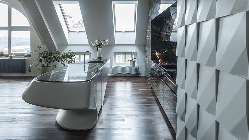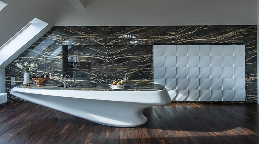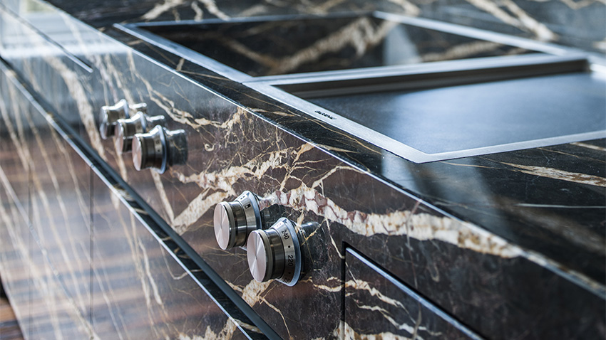 Přidaná hodnota tkví v provázanosti kresby v kameni, která prostupuje z pracovní desky jak na obklad, tak i na dvířka. Vše dokonale navazuje v efekt otevřené knihy, při realizaci si hrajeme s každým kusem skládačky, aby výsledný obraz byl opravdu impozantní.