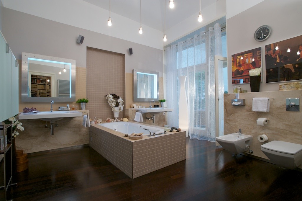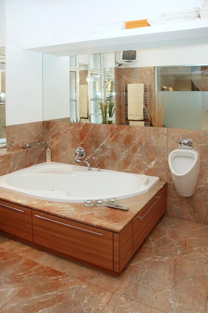 Obklady stěn a dlažba: abychom dosáhli maximálního estetického efektu, vždy plně respektujeme půdorys koupelny. Dlažbu i obklady stěn pokládáme opět do původní kresby kamene tak, aby byly u zdi zakončeny celým formátem. Důsledně dbáme na to, aby pokládkou a využitím velkých formátů dlaždic vynikla přirozená krása a kresba přírodního kamene.