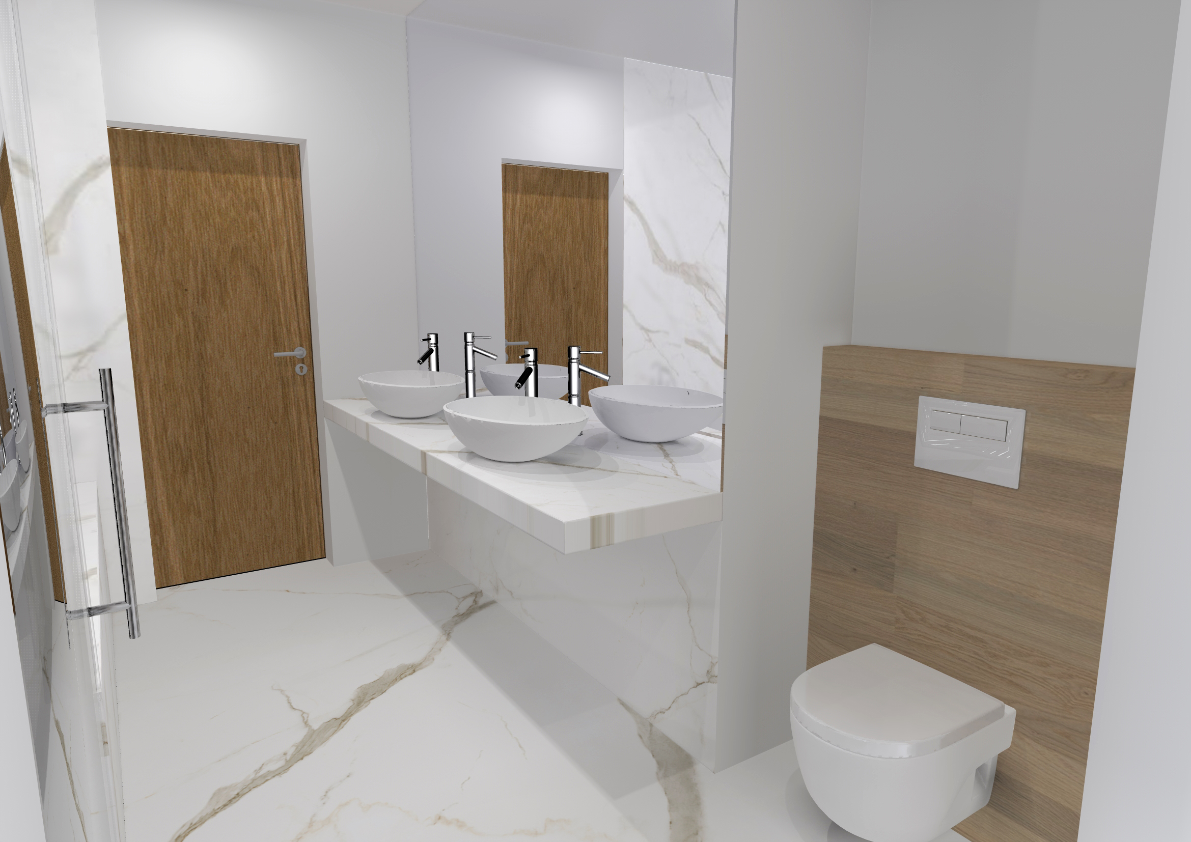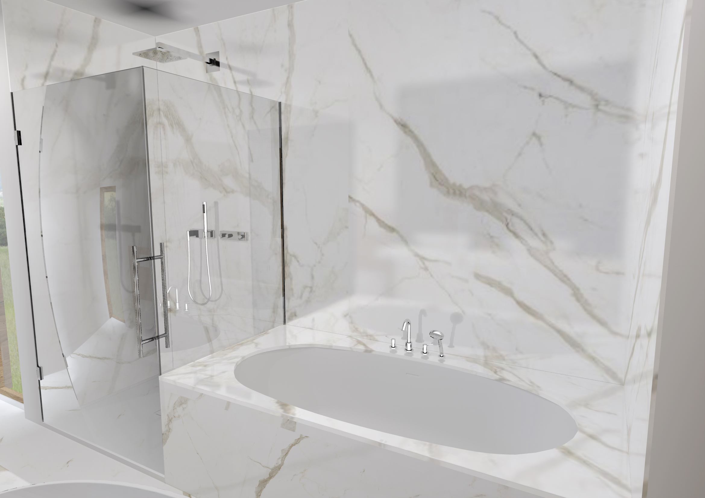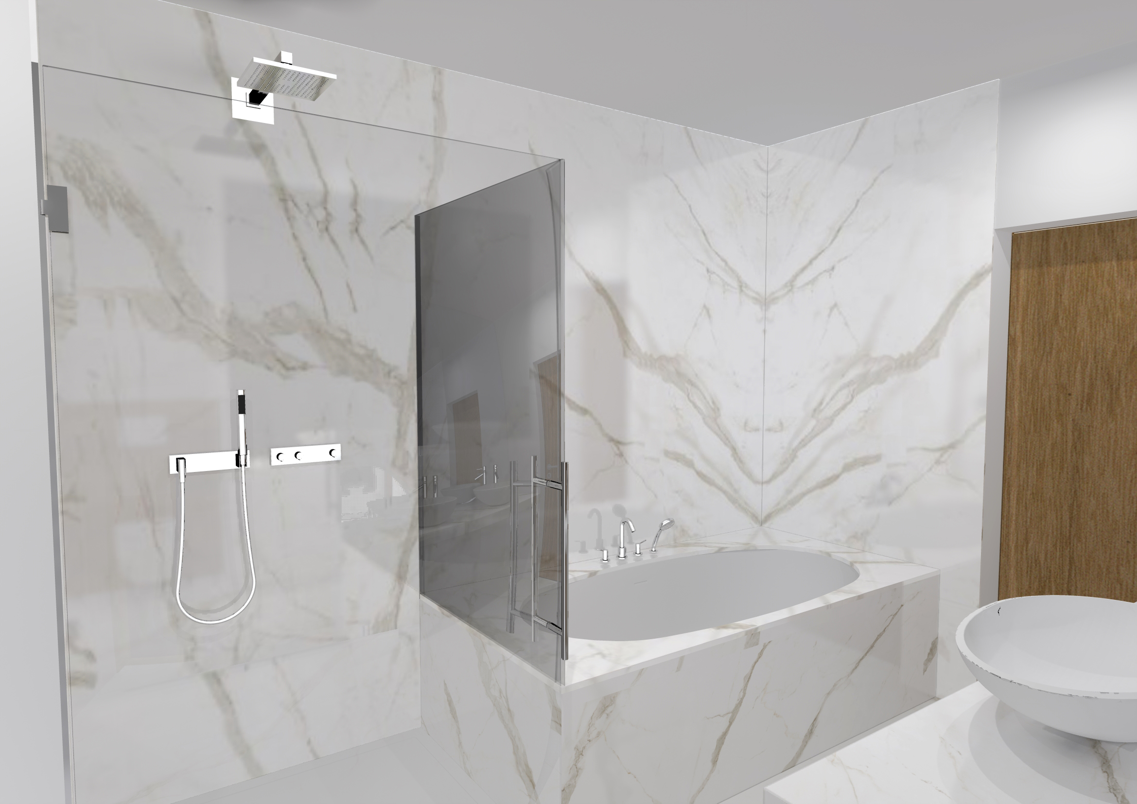 Vypadá na 100% jako přírodní kámen, a musíme uznat , že když je namontována na zdi a zaspárovaná, ideálně pokud je namontována firmou našeho formátu, čili všechny spoje jsou na pokos a otvory jsou vyrobeny vodním paprskem, NEPOZNÁME!, že se nejedná o mramorové dlažby, až do chvíle kdy se podívame proti světlu na kvalitu povrchu. Navíc formáty 3x1,5 m umožňují opravdu spektakulární podívanou.